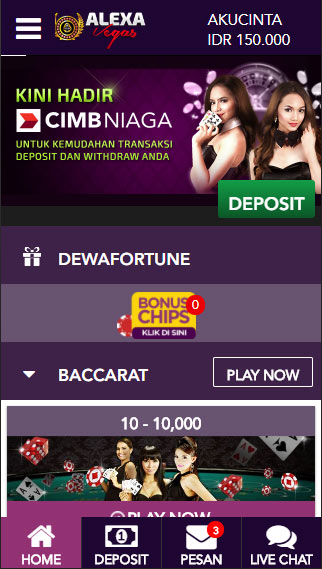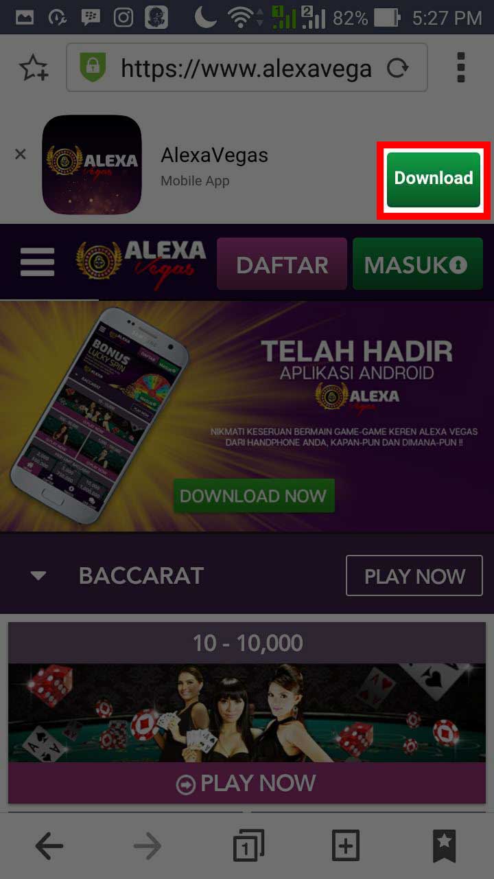 Masuk ke menu Browser Mobile anda dan Kunjungi www.alexavegas.com setelah itu klik menu MOBILE lalu klik button Download Now, dan tunggu proses download selesai.