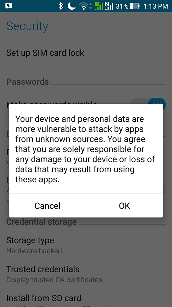 Jika sudah selesai, klik dan install langsung file Alexavegas.apk, jika muncul keterangan Install Blocked, Pilih dan Klik “Settings”, setelah itu pilih “ Unknown Source” di bagian “ Security”, Centang/Klik pada bagian seperti yang dilingkari pada gambar dibawah ini.